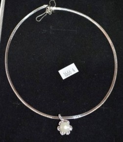 set with 49 channel set tapered baguette diamonds, clarity is VS1-S1, colour is H, also set with 1 semi round fresh water medium cream pearl, lustre is medium and is also blemish free, dimention of the pearl is 11.1mm in diameter, also comes with a 9ct Omega chain. The total comes with retail replacement value certificate of $1890.00 -