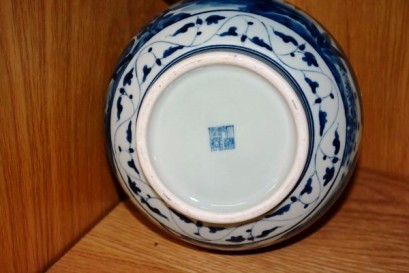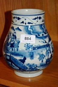 baluster shape, decorated in blue & white with figures of children playing, blue character marks to underside, height 17.5cm -