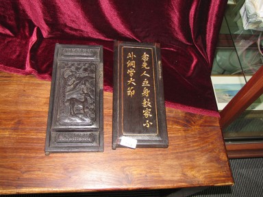 Lot Description:Two early Chinese signed carved and signed ebonized timber panels