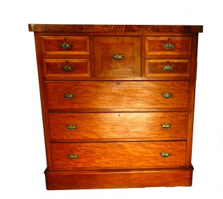 the five top short drawers with crossbanded detail above three full width drawers, all with fancy silvered drop handles, rounded corners to the top, sides and platform base. 1200 x 505 x 1280. -