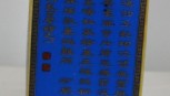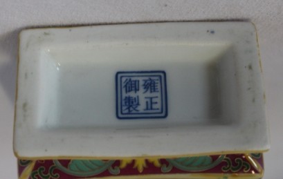 richly decorated with iron red and cobalt blue panels, with gilt script and foliate sprays on a puce ground , four character mark to base , h 13.85cm -
