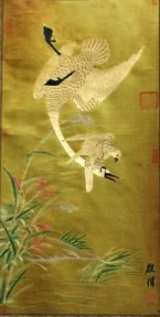 "hawk and crane in pitched battle " signed in a variety of places with chops and script in lower right , 134cm x 64cm -