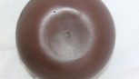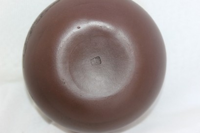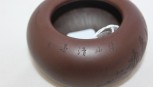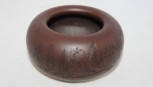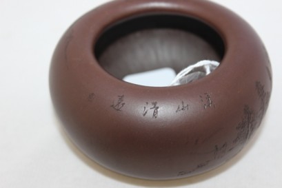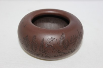 modelled in squat circular form, with softly incised decoration of a house in a rustic setting , signed in script to rim and chop to base, d 9.75cm -