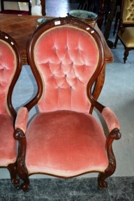 pink velour button back upholstery, carved frame -