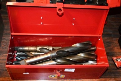 Lot Description:Red metal tool box containing a large quantity of heavy duty high speed steel drill bits