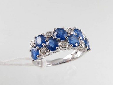 with seven oval sapphires and seven diamonds in 18ct white gold. Estimated weights: Sapphires 7 = 2.41ct, Diamonds 7 = 0.15ct. Wt 5.6g. -