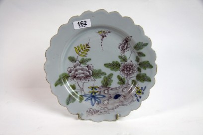with a lobed edge and painted to the centre with a Chinoiserie garden scene in a palette on greens, yellow, manganese and blue. Stilt marks under rim. Unmarked Circa 1760. Diameter 8 1/2”. -