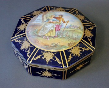 Painted roundel of shepherd & shepherdess on gilded cobalt ground. Hinged top with painted interior.