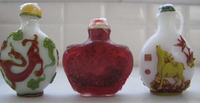 one red glass form of an elephant, one carved with deer signed with two carved seals and another carved with old dragons among clouds with two seals (3) measure 6.7cms ht -