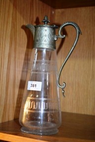 Lot #381 - Vintage etched glass claret jug with engraved silver plate mounts