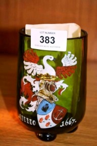 Lot #383 - Antique green glass goblet seated on 3 knob feet and hand enamelled