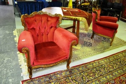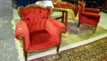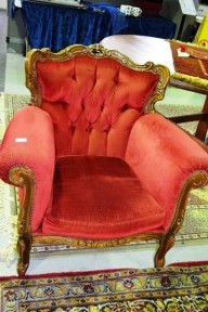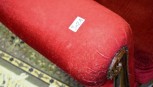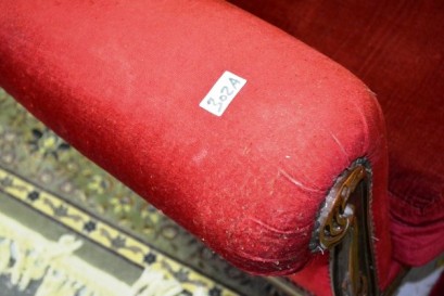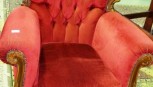 ornate design with dark pink velour button back upholstery, slight AF -