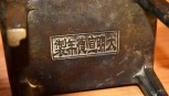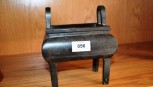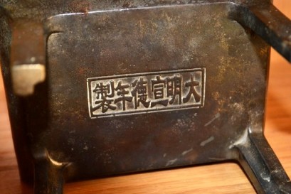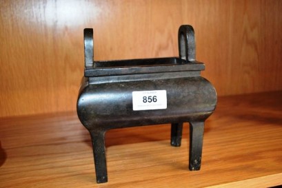 rectangular cauldron form on 4 raised legs with twin lug handles, height is 18cm, impressed characters to underside -