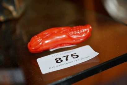 Lot Description:Small carved Chinese red coral pendant in the form of a corn cob with a mouse