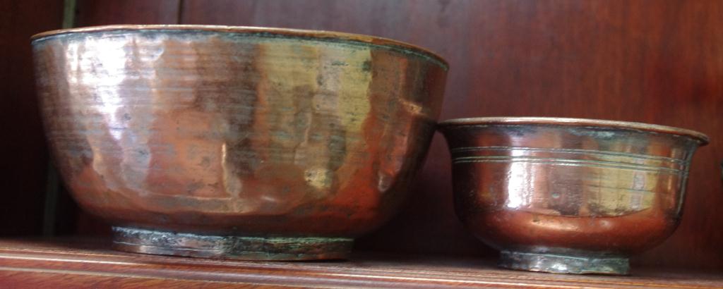 Lot Description:Two antique hand beaten copper bowls
