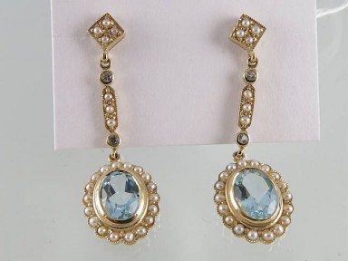 Lot #131 - A Pretty Pair of Seed Pearl and Blue Topaz Drop Earrings