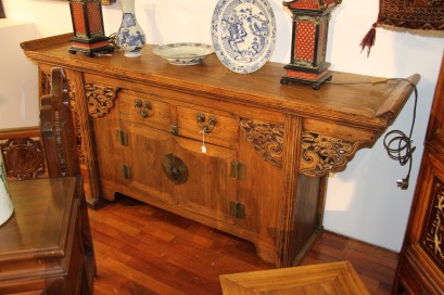 with Arts & Crafts influence, quarter sawn panels and barley twist columns. Columns with carved relief floral decoration. The break front top over drawers and cupboards with brass handles and decorative copper strap hinges.
