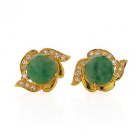 Stamped 'PJPK', each with a round green jadeite stone in a floral leaf mount set with small diamonds. Weight 5.8g. -