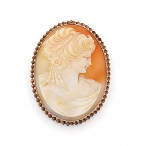 Finely carved helmet shell with a portrait of a beautiful young lady. 9ct gold mount with ribbon twist border. Length 52mm. -