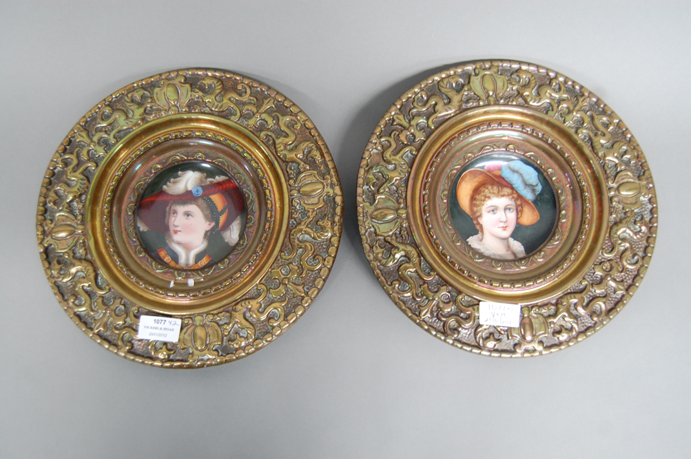 Lot #1077 - Pair of antique French pressed copper and porcelain portrait plaques