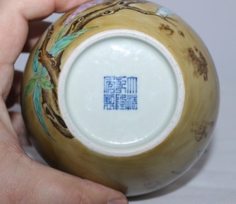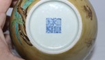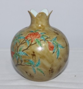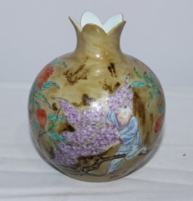 modelled in the form of a pomegranate , with a single figure of a boy, straddling a withering tree branch, retrieving a scarf, on a tan ground, Qianlong Seal Mark to base, h 13cm -