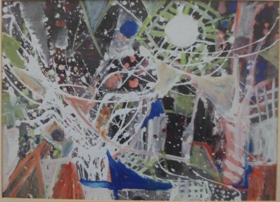 Gouache on card. Signed lower right and lower left. Titled ,"Theatre" to mount. 26 x 36 cm. -