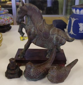 23cm high approx., together with 2 metal birds & a metal seated figure -