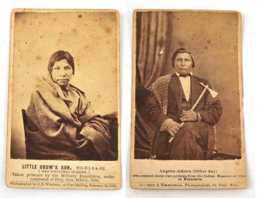 Including Anpetu-Tokeca (Other Day) Circa 1862 ...'Who Rescued Sixty-Two Persons From The Indian Massacre Of 1862 In Minnesota' And Photographer's Credit 'Whitney & Zimmerman, Photographers, st Paul, Minn.'; And Little Crow's Son Wo-Wi-Na-Pe (One Who Comes In Sight) With Printed Inscription To Card Mount 'Taken Prisoner By The Military Expedition, Under The Command Of Brig. Gen. Sibley, 1863', 'By J.E. Whitney At Fort Snelling, February, 1864', 10 x 6cm (2) -