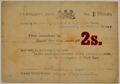 No. B9608,'Issued By Colonel R.S.S. Baden-Powell Commanding The Rhodesian Forces', With Facsimile Signature Of Capt. H. Greener Chief Paymaster. The Siege Of Mafeking Took Place Between 1899-1900 During The Second Boer War And Led To A Famous Victory For The British. Col. Baden-Powel Commanded A Small Force Of Locally Gathered Troops To Defend The Key Border Town Of Mafeking. Currency Was In Short Supply So Temporary Banknotes Were Issued.