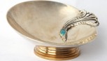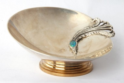 marked for Flynn of Kyneton, stepped gilt foot on which a plain circular bowl tilted at angle, with peacock motif to one side set with opal, weight 120gm, d 9cm -