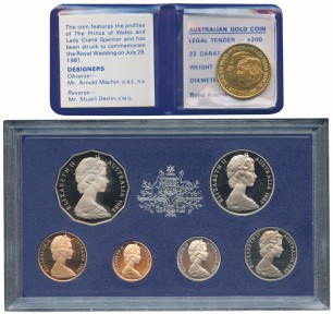 1981 Unc. $200 GOLD Royal Wedding in wallet, 1981-83 Proof sets, with foam and certificates and 1985 ÔVictoria' Unc. silver $10 x3. -