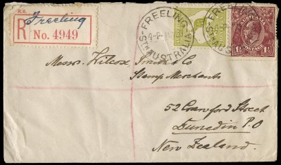 Die I and 1?d Red-brown KGV on a registered cover, Freeling, Sth. Aust. - New Zealand. With a provisional reg. label annotated 'Freeling' and 2 b/stamps. -