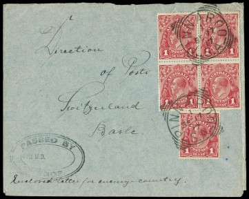 Lot Description:C - 1917 (17 Sept.) usage of 1d Rose as a block of 4 and a single on a censored cover to Switzerland