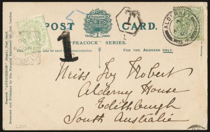 Design Completed, perf. 11 x12 (BW.D15) on an incoming postcard franked ?d, Alderney, Channel Islands - Sth. Aust. with octagonal 'T' and '1' h/stamps. The postage due tied by an Edithburgh, square circle. -
