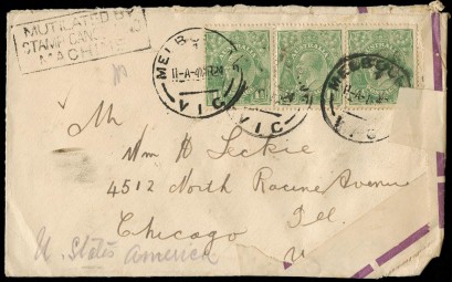 USA cover franked with 1?d Green KGV, horiz. strip of 3, heavily repaired with a violet stamp selvedge. Handstamped at top R with black boxed 'MUTILATED BY / STAMP CANCELLING / MACHINE'.A rarely seen instructional mark. -