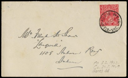 franked with 1?d Red KGV tied by 'GLENMAGGIE WEIR / VIC' cds, open 1920-28, rated RR by WWW. -