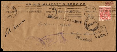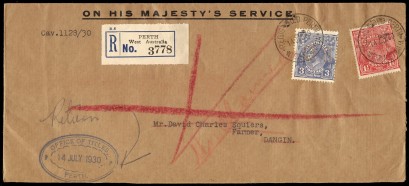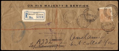 unclaimed and returned or redirected, from the Perth Titles or Dead Letter Office. All KGV frankings, with 17 registered covers, franked 4?d (1?d + 3d) or 5d (single franking) and 5 covers franked 1?d. All with various instructional markings. -