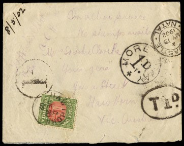 from an officer in the Aust. Commonwealth Horse, addressed to Victoria. Endorsed in pencil 'C. W. St John Clarke, Lt. 4th Batt. A.C.H.', 'On active service' and 'No stamps available'. With Newcastle, Natal 'MY 13 1902' cds at top R, 3 different '1d' tax h/stamps and 3 b/stamps. Very scarce as regiment arrived in Sth Africa in April 1902. -