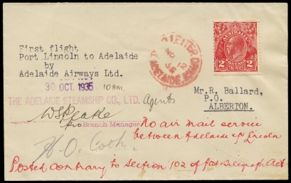 endorsed 'First Flight Port Lincoln...', 'No air mail service between...', 'Posted contrary to Section 102 of Post Telegraph Act' and with red 'DEAD LETTER OFFICE / ADELAIDE', 'NO12/35' cds. Plus a b/w photograph of Irene Dean-Williams with Harry ÔCannonball' Baker, refer AAMC.260b. -