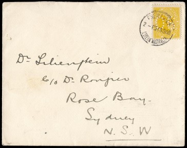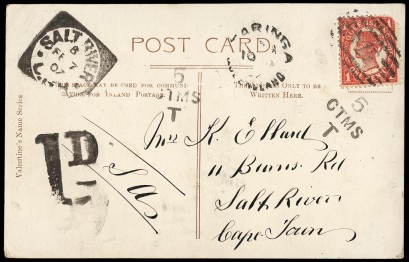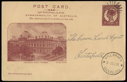 Queensland 1d on 1897 short-paid postcard from KARINGA to SALT RIVER C.O.G.H.; 1901, 1908 & 1910 usages of 1d illustrated Postal Cards (all different printings); 2 postcards wth Paquebot markings; W.A. 2d perf.OS on 1908 official cover to Sydney; etc. (9 items). -