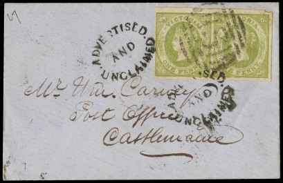 addressed to 'Mr Wm. Carney / Post Office / Castlemaine', franked with a pair of 1d green imperf. Emblems tied by Barred Numeral '3' and with two (1 very fine) strikes of the unframed 'ADVERTISED / AND / UNCLAIMED' h/stamp. Dated by the Castlemaine Crown Oval h/stamp on the reverse. A delightful cover. -
