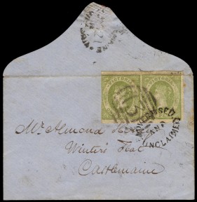Castlemaine, franked with 1d Emblems pair, tied by barred numeral '3' of Castlemaine and 'ADVERTISED / AND / UNCLAIMED' h/stamp, which was in use to 1860. With a dated Castlemaine oval b/stamp. It was a legal requirement that mail sent to goldfield Post Offices for itinerant workers had to be advertised. -