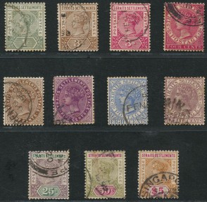 QV definitive set of 11. Plus 1899 (SG.110-121) 1c to $5, KEVII definitives, 11 of 12. Both sets commercially used. Mixed condition. -