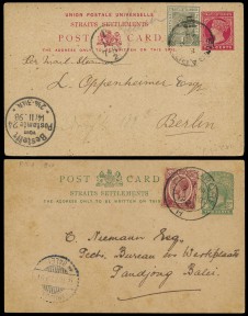 uprated 1c from SINGAPORE to BERLIN with arrival cds and printed message; also, Nov.1923 usage of 2c green KGV Postal Card, uprated 6c or delivery to TANDJONG BALEI, with arrival cds, also with printed message. (2). -