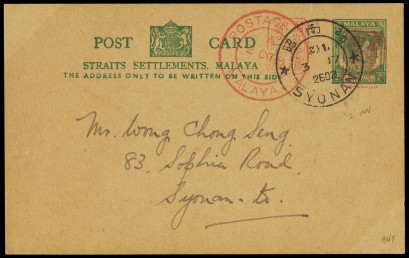 Lot Description:PS - JAPANESE OCCUPATION: 2c green Postal Card handstamped 'POSTAGE PAID MALAYA 2cts' in red