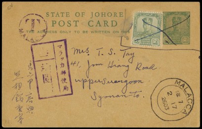 used in MALACCA and addressed to Singapore; with circular 'T/MALACCA' postage due marking and censorship chop at left. -