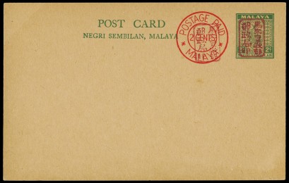 Lot Description:PS - JAPANESE OCCUPATION: 1942 Negri Sembilan 2c Postal Card with printed 'POSTAGE PAID MALAYA 2 CENTS'