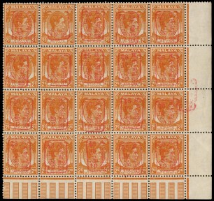 inger.43, Tan.J15) 2c orange, KGVI Straits Settlements, lower R corner block of 20, handstamped in red with the single frame seal. With an additional misplaced handstamp between the last column and right margin. -