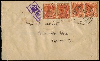 (SG.J148) tied by double-ring SYONAN cds on locally addressed cover, with censor chop at left. Some damage on opening. -