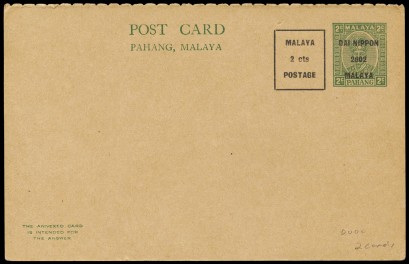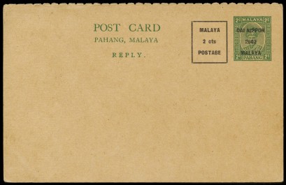 Lot #376 - PS - POSTAL STATIONERY: 1942 PAHANG 2c green Reply Card uprated 2c and overprinted